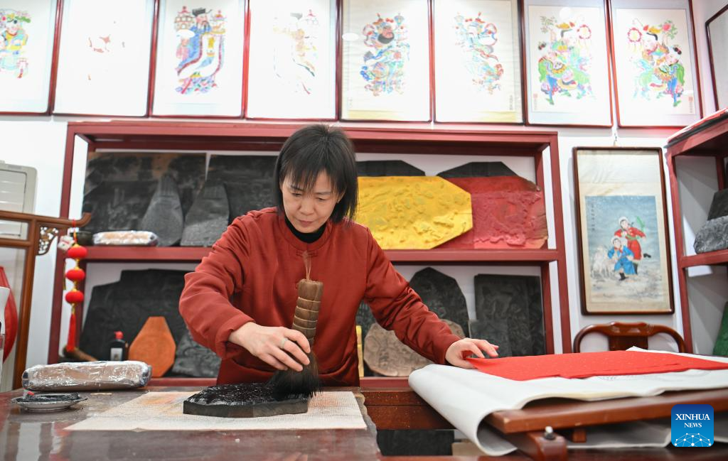 An inheritor of Yangliuqing woodblock new year picture craft prepares to print a new year picture at a studio in Yangliuqing Town, Tianjin, north China, Jan. 20, 2025.
