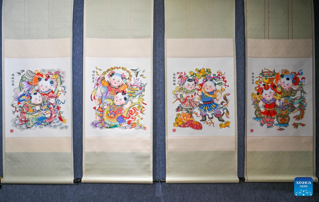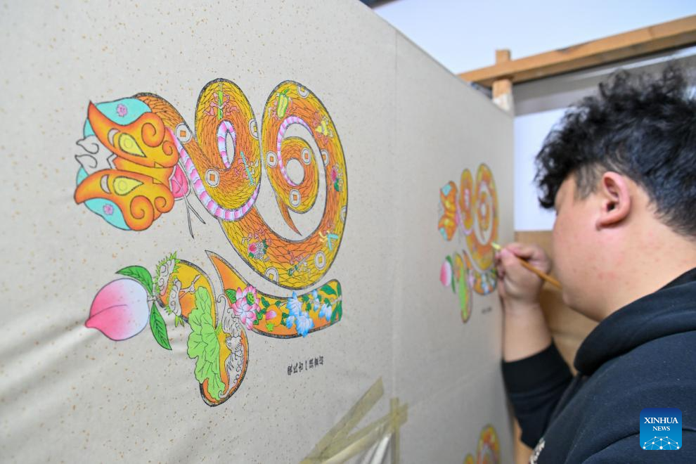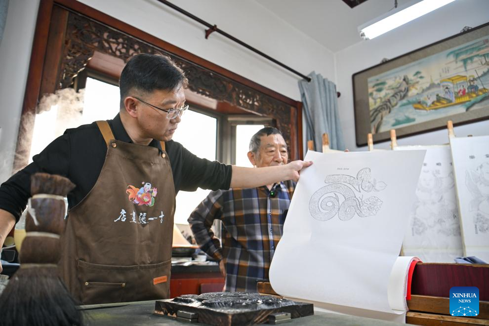 With the approaching of the lunar new year, a series of cultural and creative products carrying the Yangliuqing woodblock new year pictures have been created under the inspiration of the Year of the Snake. (Xinhua/Sun Fanyue)