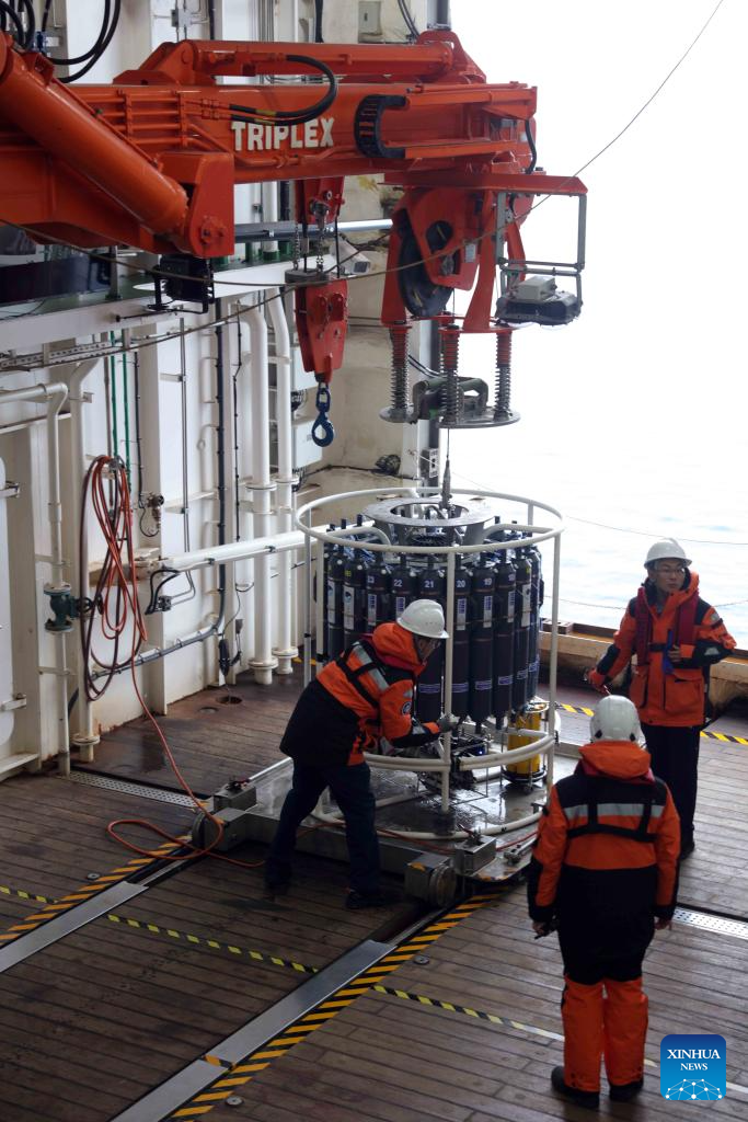 Members of China's 41st Antarctic expedition team prepare to deploy a Conductivity, Temperature, and Depth (CTD) instrument on Chinese research icebreaker Xuelong 2, Jan. 18, 2025. Chinese research icebreaker Xuelong 2, or Snow Dragon 2, is conducting a month-long marine ecosystem survey in the Amundsen Sea, which include a comprehensive investigation and monitoring of biological ecology, water, sedimentary and atmospheric environment, and pollutant distribution. Members of the expedition team decorated the vessel to greet the upcoming Spring Festival. (Xinhua/Huang Taoming)