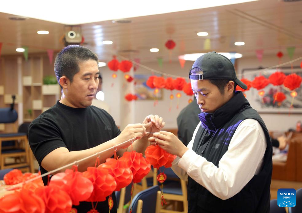 Members of China's 41st Antarctic expedition team decorate the dining hall on Chinese research icebreaker Xuelong 2, Jan. 23, 2025. Chinese research icebreaker Xuelong 2, or Snow Dragon 2, is conducting a month-long marine ecosystem survey in the Amundsen Sea, which include a comprehensive investigation and monitoring of biological ecology, water, sedimentary and atmospheric environment, and pollutant distribution. Members of the expedition team decorated the vessel to greet the upcoming Spring Festival. (Xinhua/Huang Taoming)