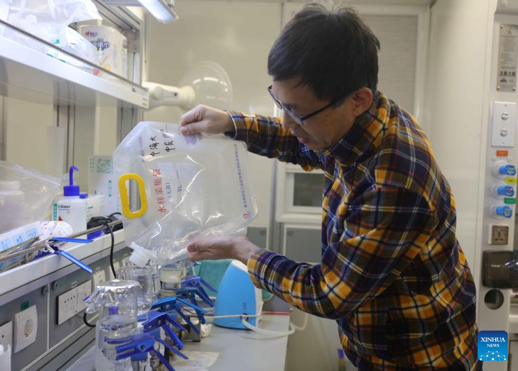 A member of China's 41st Antarctic expedition team filters the water sample on Chinese research icebreaker Xuelong 2, Jan. 22, 2025. Chinese research icebreaker Xuelong 2, or Snow Dragon 2, is conducting a month-long marine ecosystem survey in the Amundsen Sea, which include a comprehensive investigation and monitoring of biological ecology, water, sedimentary and atmospheric environment, and pollutant distribution. Members of the expedition team decorated the vessel to greet the upcoming Spring Festival. (Xinhua/Huang Taoming)