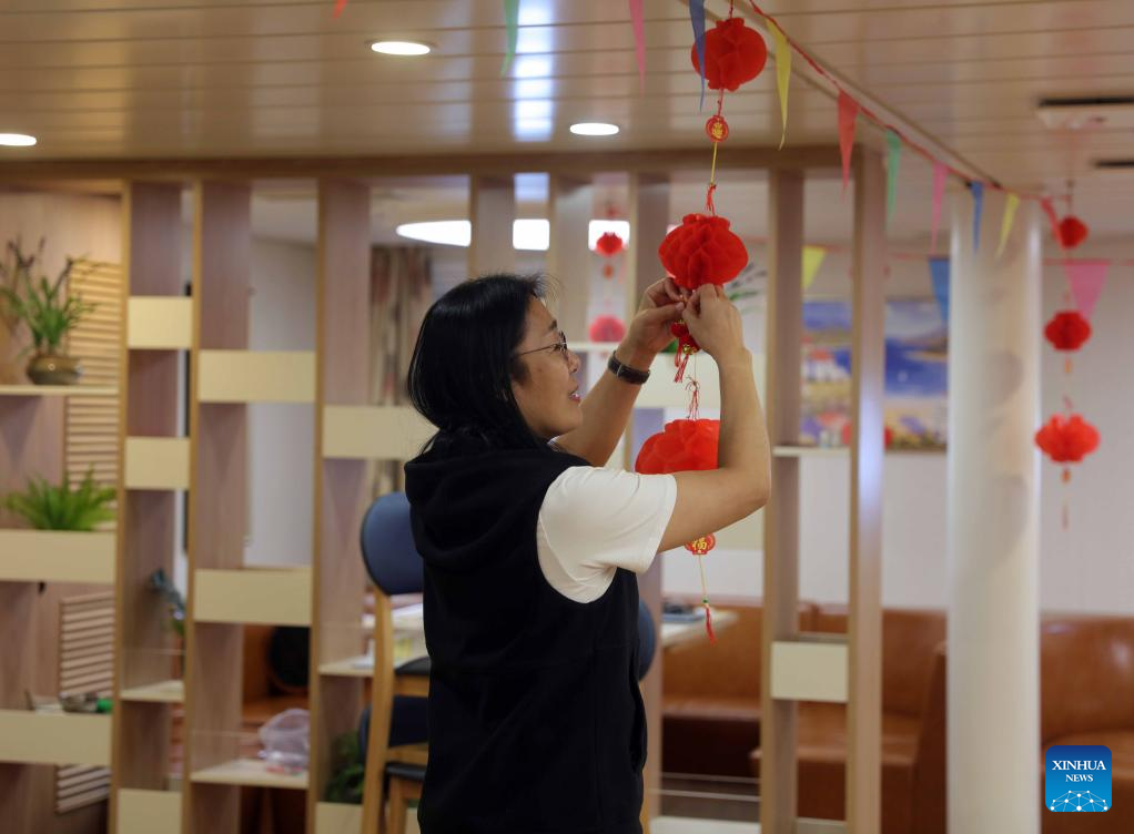 A member of China's 41st Antarctic expedition team decorates the dining hall on Chinese research icebreaker Xuelong 2, Jan. 23, 2025. Chinese research icebreaker Xuelong 2, or Snow Dragon 2, is conducting a month-long marine ecosystem survey in the Amundsen Sea, which include a comprehensive investigation and monitoring of biological ecology, water, sedimentary and atmospheric environment, and pollutant distribution. Members of the expedition team decorated the vessel to greet the upcoming Spring Festival. (Xinhua/Huang Taoming)