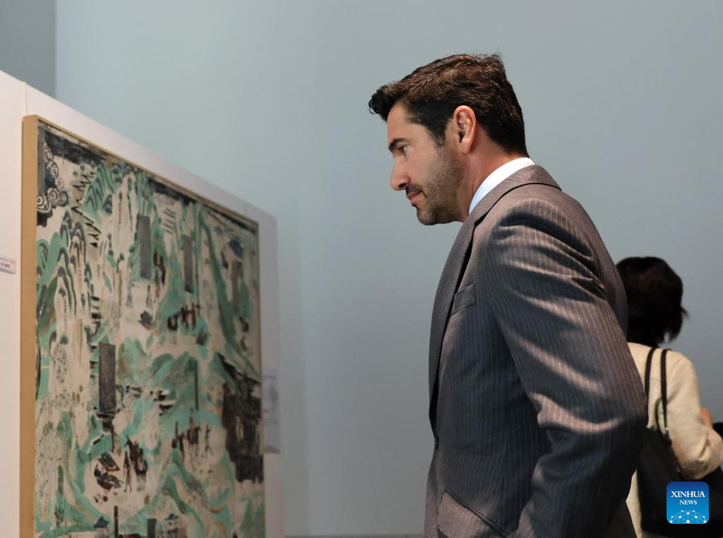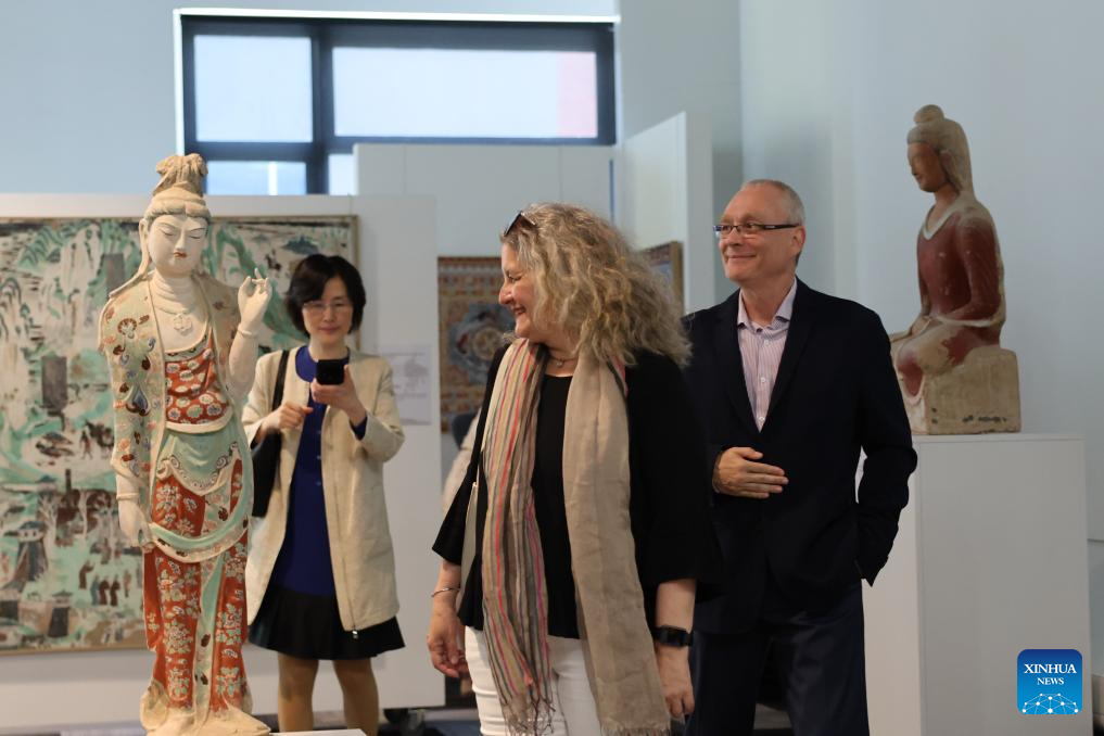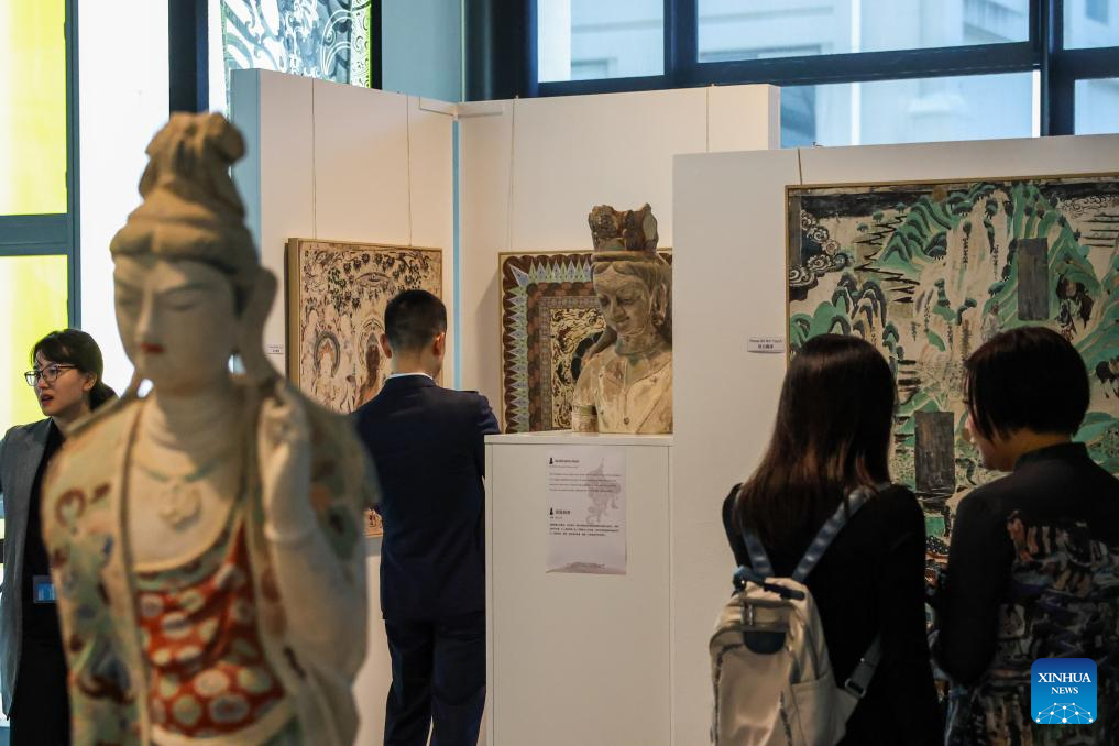 People visit the Dunhuang Art Festival at Wellington College of Technology in Wellington, New Zealand, Jan. 23, 2025. The exhibition was organized by the Chinese Embassy in New Zealand. (Photo by Meng Tao/Xinhua)