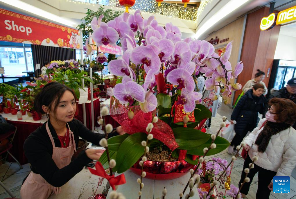 A florist arranges flowers at the 2025 Chinese Lunar New Year Flower and Gift Fair in Richmond, British Columbia, Canada, Jan. 23, 2025. The fair kicked off here on Thursday and runs until Jan. 29. (Photo by Liang Sen/Xinhua)