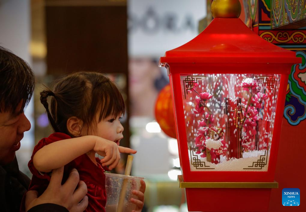 A young girl takes a close look at a festive decoration at the 2025 Chinese Lunar New Year Flower and Gift Fair in Richmond, British Columbia, Canada, Jan. 23, 2025. The fair kicked off here on Thursday and runs until Jan. 29. (Photo by Liang Sen/Xinhua)