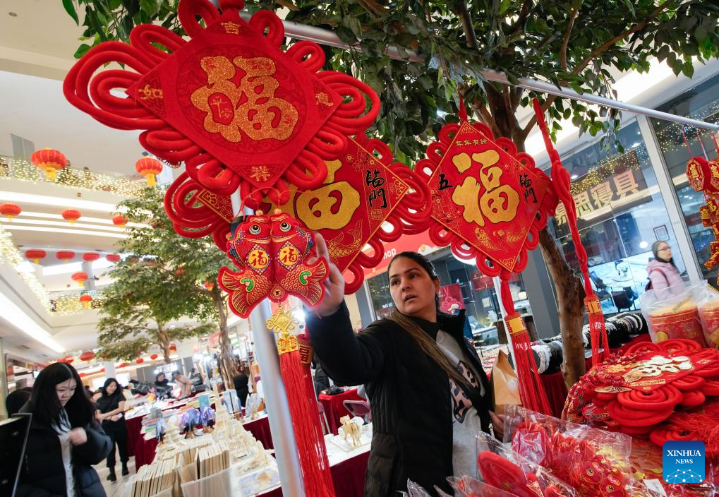 A woman selects festive decorations at the 2025 Chinese Lunar New Year Flower and Gift Fair in Richmond, British Columbia, Canada, Jan. 23, 2025. The fair kicked off here on Thursday and runs until Jan. 29. (Photo by Liang Sen/Xinhua)