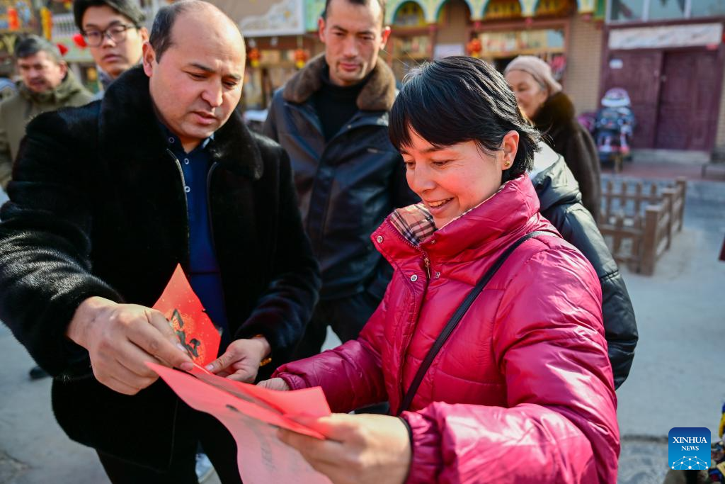 A resident receives Spring Festival couplets during a "village gala" in Shache County of Kashgar, northwest China's Xinjiang Uygur Autonomous Region, Jan. 22, 2025.