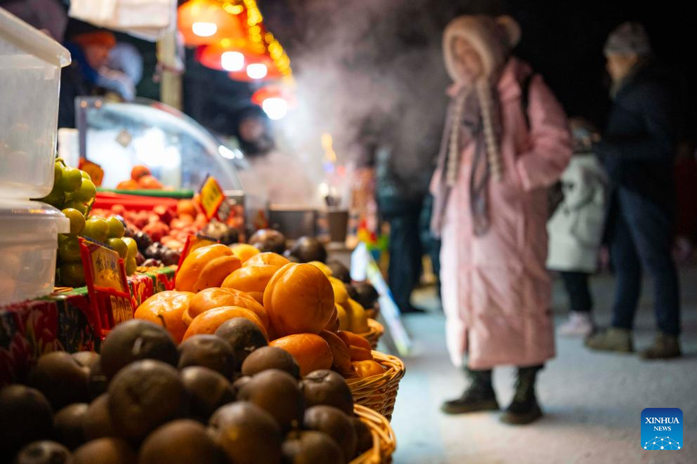 Visitors select local delicacy at China's "Snow Town" scenic spot in Mudanjiang, northeast China's Heilongjiang Province, Jan. 24, 2025.