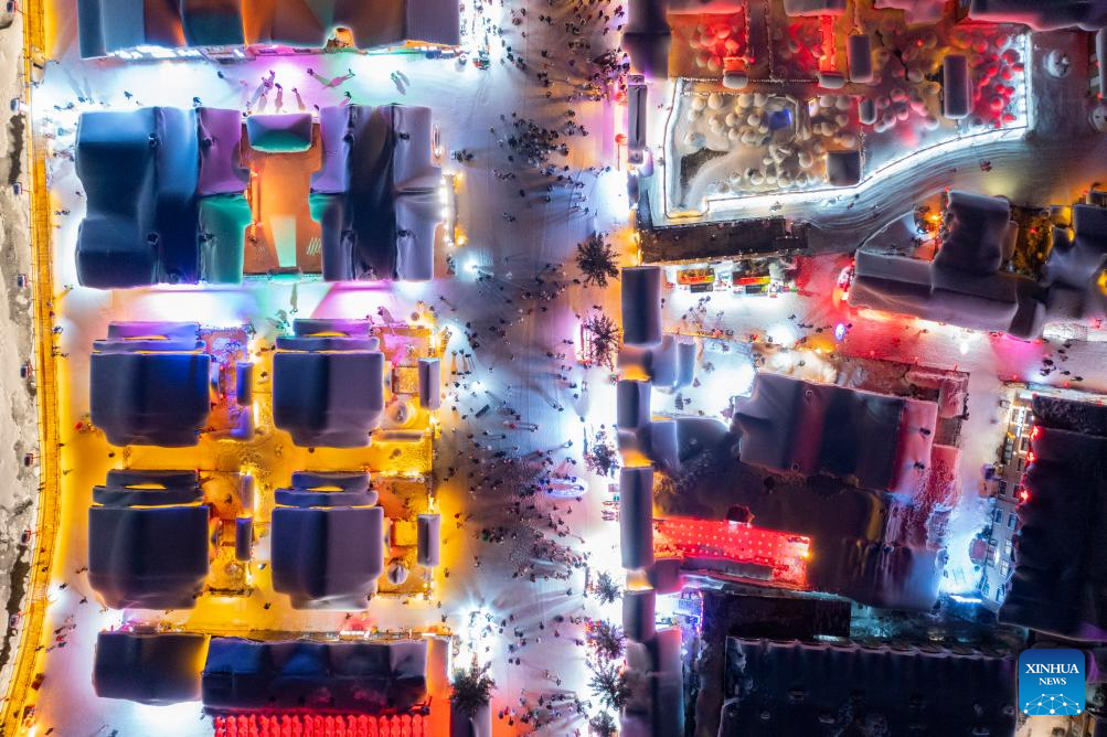 A drone photo taken on Jan. 24, 2025 shows a night view at China's "Snow Town" scenic spot in Mudanjiang, northeast China's Heilongjiang Province.