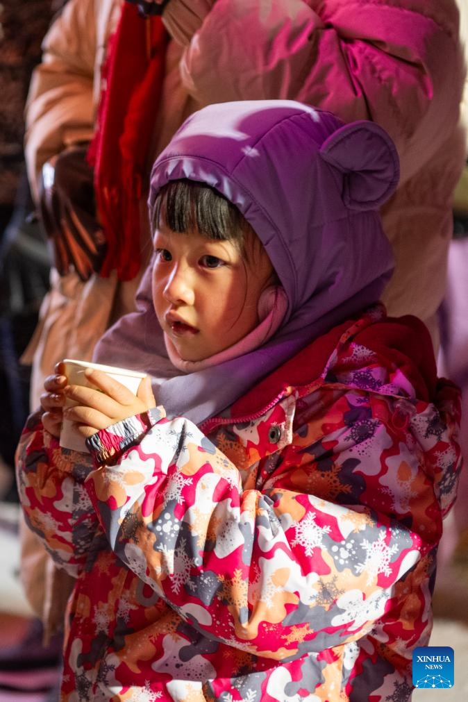 A child drinks free hot ginger soup at China's "Snow Town" scenic spot in Mudanjiang, northeast China's Heilongjiang Province, Jan. 24, 2025.