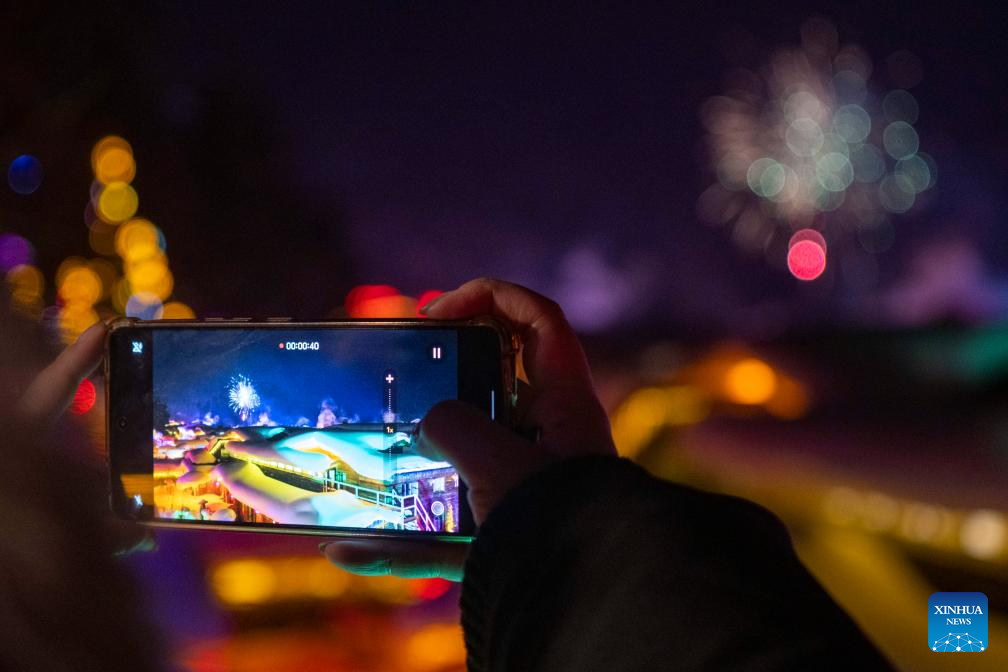 A visitor takes photos of a firework show at China's "Snow Town" scenic spot in Mudanjiang, northeast China's Heilongjiang Province, Jan. 24, 2025.