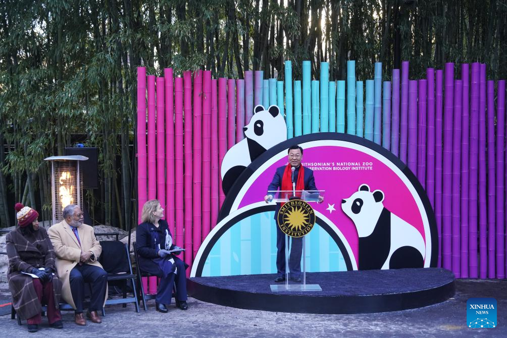Chinese Ambassador to the United States Xie Feng addresses the ceremony to celebrate the official public debut of the giant pandas at the Smithsonian's National Zoo in Washington, D.C., the United States, Jan. 24, 2025. The giant panda couple, Bao Li and Qing Bao, made their first public appearance on Friday since their arrival at the Smithsonian's National Zoo here. Sent as part of a 10-year international giant panda protection cooperation program, the three-year-old pandas, Bao Li, male, and Qing Bao, female, departed their hometown in Sichuan Province and arrived in the U.S. capital city on Oct. 15, 2024. (Xinhua/Wu Xiaoling)