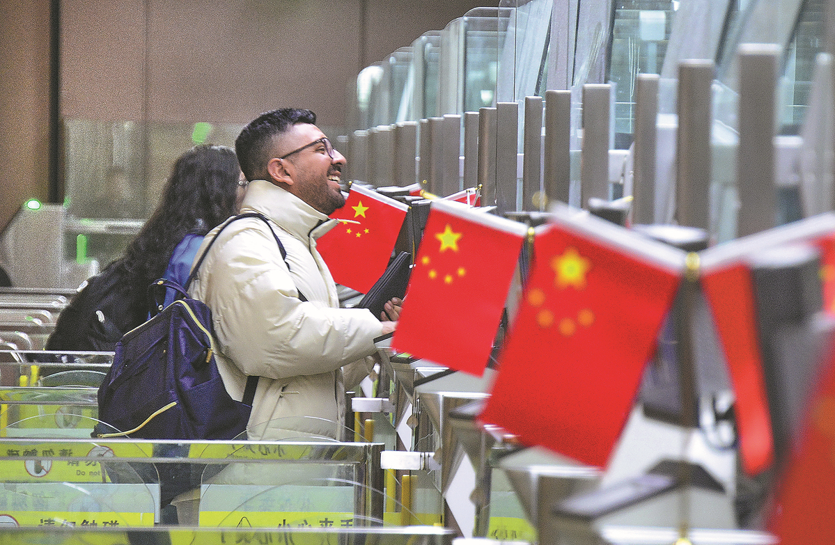 Foreign tourists enter China at an immigration inspection station at Beijing Daxing International Airport in Beijing on Jan 2. (Li Xin/Xinhua)
