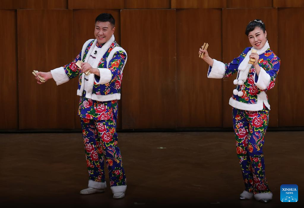 Chinese artists from Jilin Art Troupe perform a song-and-dance duet from northeast China, Errenzhuan, to celebrate the upcoming Spring Festival at the Kolarac Concert Hall in Belgrade, Serbia, on Jan. 23, 2025. (Photo by Predrag Milosavljevic/Xinhua)