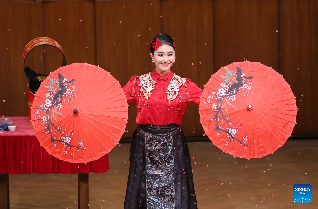 A Chinese artist from Jilin Art Troupe performs to celebrate the upcoming Spring Festival at the Kolarac Concert Hall in Belgrade, Serbia, on Jan. 23, 2025. (Photo by Predrag Milosavljevic/Xinhua)