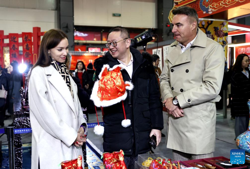 Members of the diplomatic corps select products at a festive event for the upcoming Chinese New Year, or the Spring Festival, in Langfang, north China's Hebei Province, Jan. 23, 2025. (Xinhua/Wang Xiao)