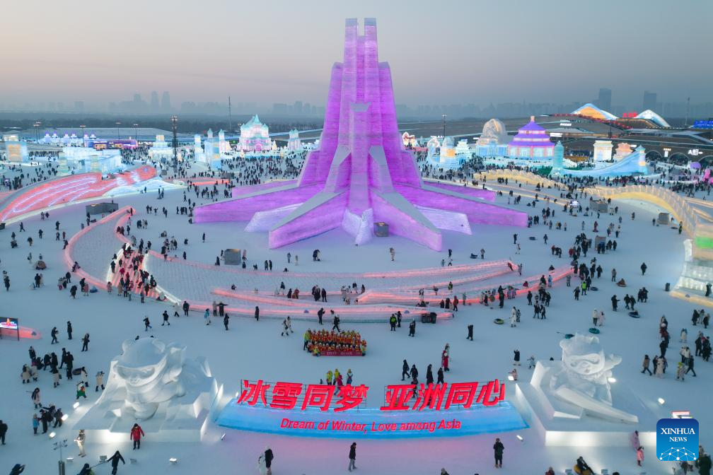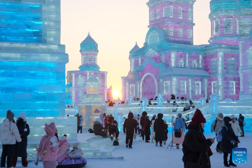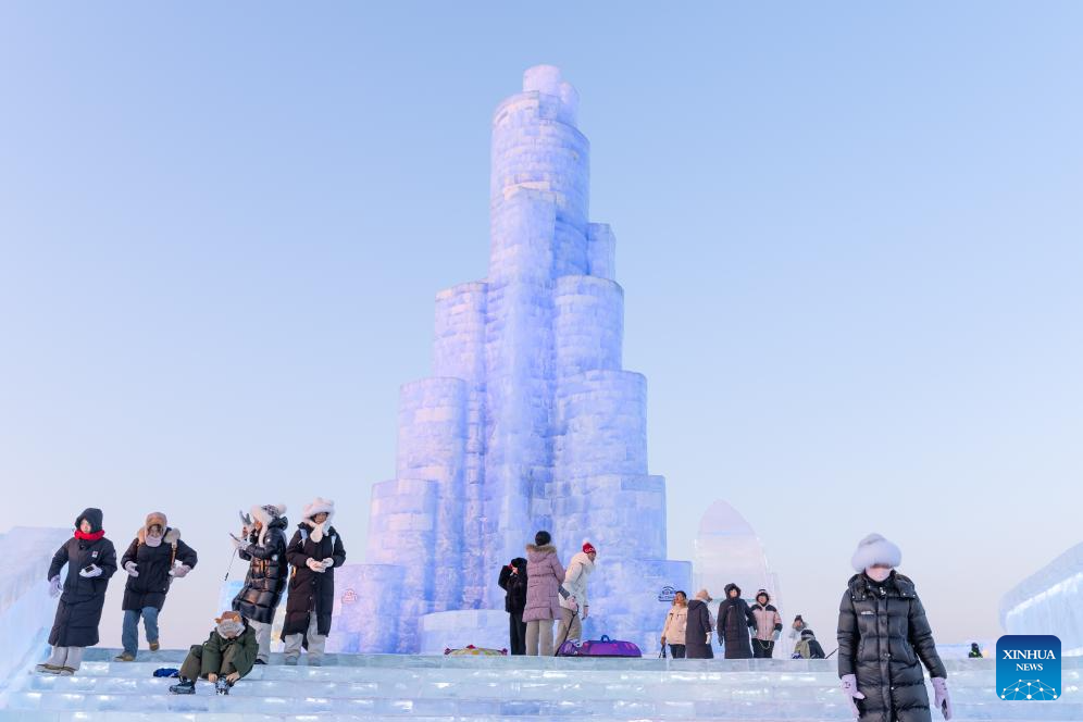 Tourists have fun at the Harbin Ice-Snow World in Harbin, capital of northeast China's Heilongjiang Province, Jan. 23, 2025. Harbin has emerged as one of the country's top winter travel destinations, attracting visitors from around the globe. As the city's iconic landmark, the Harbin Ice-Snow World, with this year's edition, the largest in its history, boasts 1 million square meters. (Xinhua/Wang Jianwei)