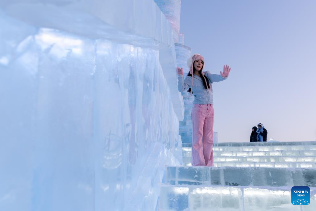 A tourist poses for photos at the Harbin Ice-Snow World in Harbin, capital of northeast China's Heilongjiang Province, Jan. 23, 2025. Harbin has emerged as one of the country's top winter travel destinations, attracting visitors from around the globe. As the city's iconic landmark, the Harbin Ice-Snow World, with this year's edition, the largest in its history, boasts 1 million square meters. (Xinhua/Zhang Tao)