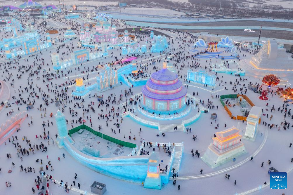 An aerial drone photo show tourists having fun at the Harbin Ice-Snow World in Harbin, capital of northeast China's Heilongjiang Province, Jan. 22, 2025. Harbin has emerged as one of the country's top winter travel destinations, attracting visitors from around the globe. As the city's iconic landmark, the Harbin Ice-Snow World, with this year's edition, the largest in its history, boasts 1 million square meters. (Xinhua/Xie Jianfei)