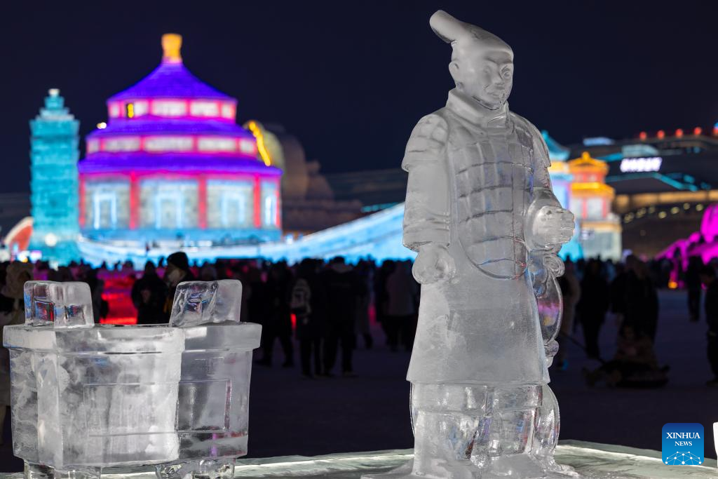 This photo shows an ice-carved "Terracotta Warrior" at the Harbin Ice-Snow World in Harbin, capital of northeast China's Heilongjiang Province, Jan. 23, 2025. Harbin has emerged as one of the country's top winter travel destinations, attracting visitors from around the globe. As the city's iconic landmark, the Harbin Ice-Snow World, with this year's edition, the largest in its history, boasts 1 million square meters. (Xinhua/Zhang Tao)