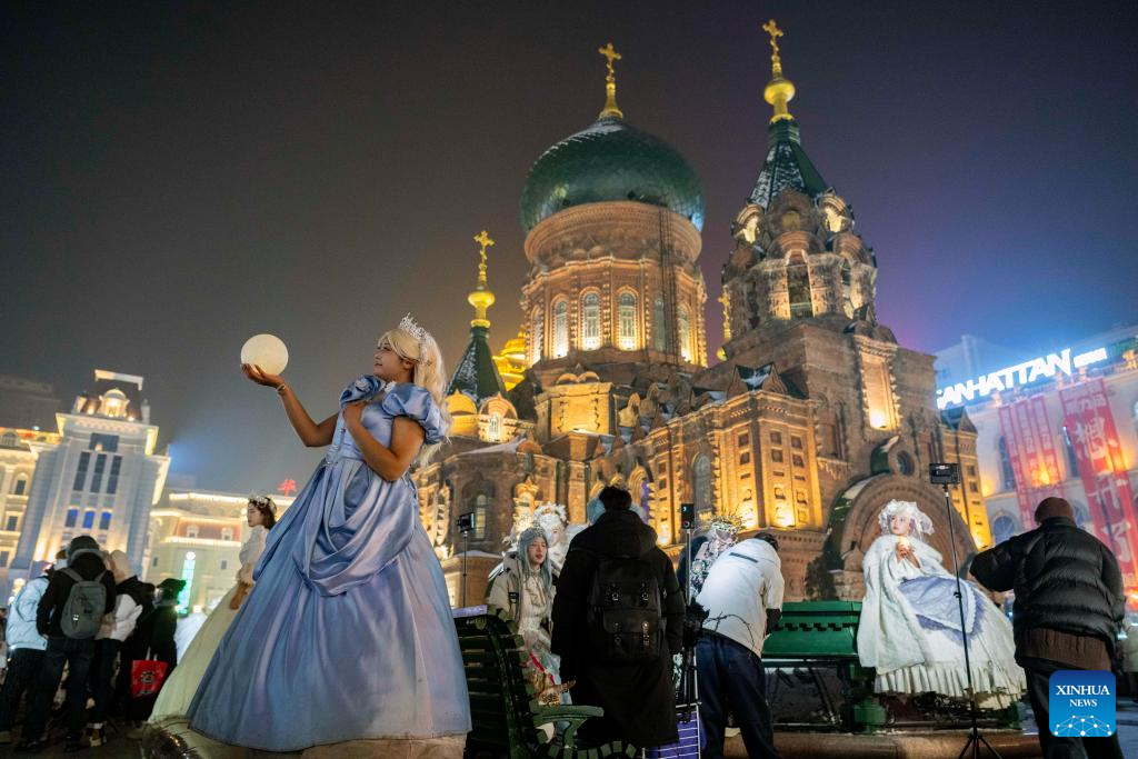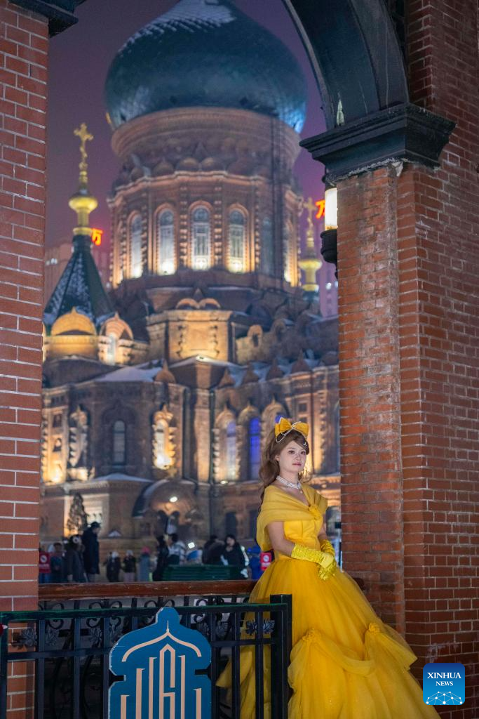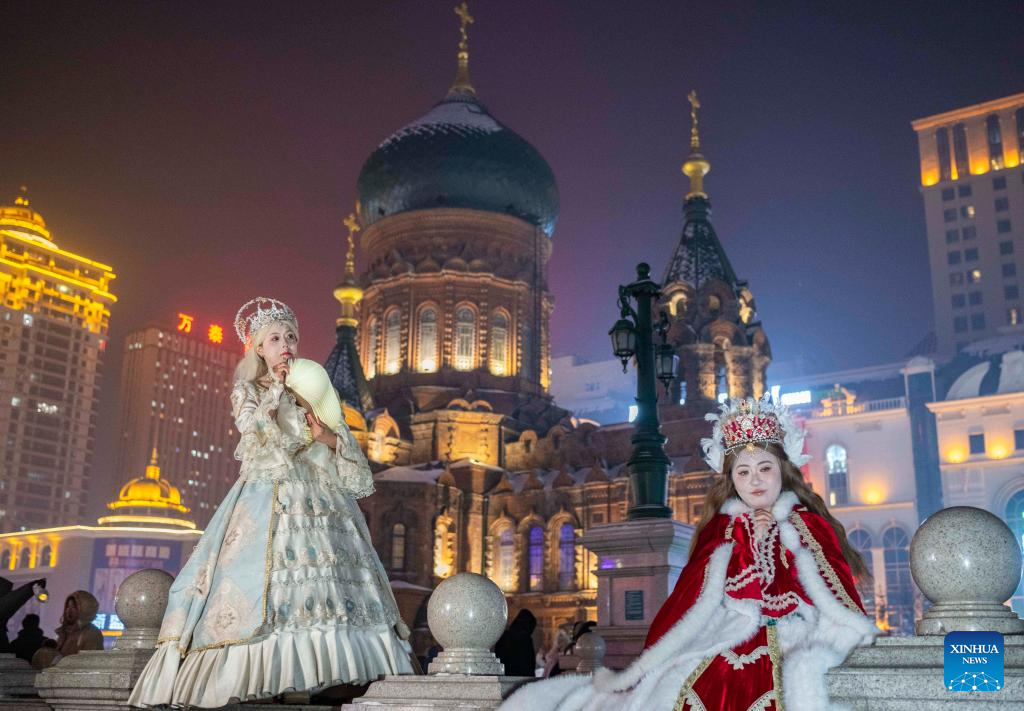 Tourists in costumes pose for photos near the St. Sophia Cathedral in Harbin, capital of northeast China's Heilongjiang Province, Jan. 23, 2025. Harbin's centerpiece tourist attraction St. Sophia Cathedral, a centuries-old Byzantine-style building, provides an ideal setting for ladies wearing seemingly opulent attire for a marvel moment in their excursions. (Xinhua/Xie Jianfei)