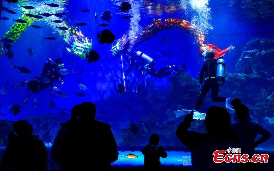 Tourists watch an underwater dragon dance performance at Wuhan Haichang Polar Ocean Park in central China's Hubei Province, Jan. 25, 2025. (China News Service/Zhang Chang)
