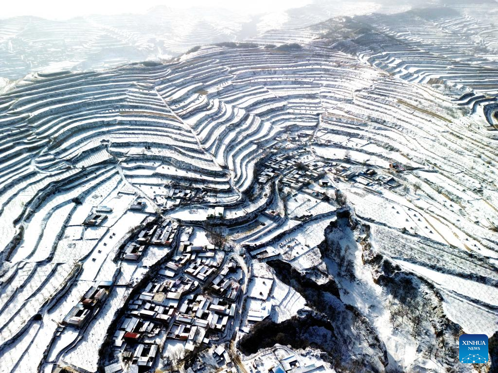 An aerial drone photo shows the snow scenery of terraced fields in Shuangxian Town of Pingliang City, northwest China's Gansu Province, Jan. 26, 2025. (Photo by Wang Yi/Xinhua)