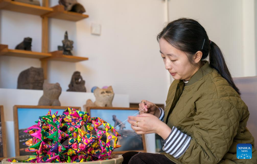 Yang Jie makes a rhombic straw plaited work at her studio in Kunming, southwest China's Yunnan Province, Jan. 25, 2025. The art of rhombic straw plaiting is a traditional handicraft with a long history. It was included in the third batch of Yunnan's provincial intangible cultural heritage list in 2013. Artisans sort and dye straws, and weave them into triangular shapes. Finally, they are strung together by thread to create various designs symbolizing good fortune.