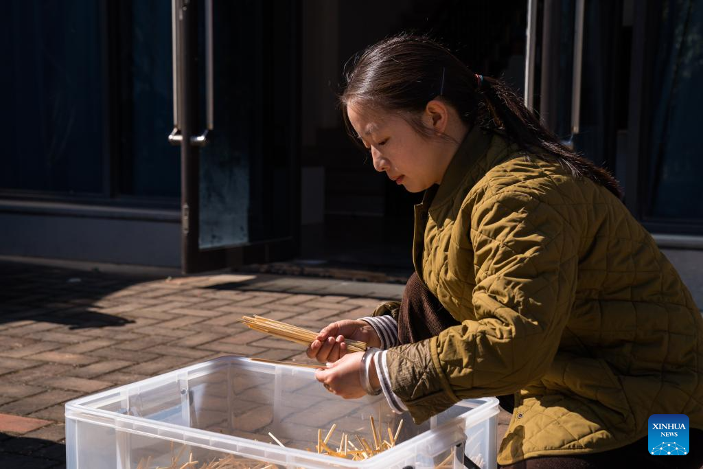 Yang Jie sorts out straws at her studio in Kunming, southwest China's Yunnan Province, Jan. 25, 2025. The art of rhombic straw plaiting is a traditional handicraft with a long history. It was included in the third batch of Yunnan's provincial intangible cultural heritage list in 2013. Artisans sort and dye straws, and weave them into triangular shapes. Finally, they are strung together by thread to create various designs symbolizing good fortune.