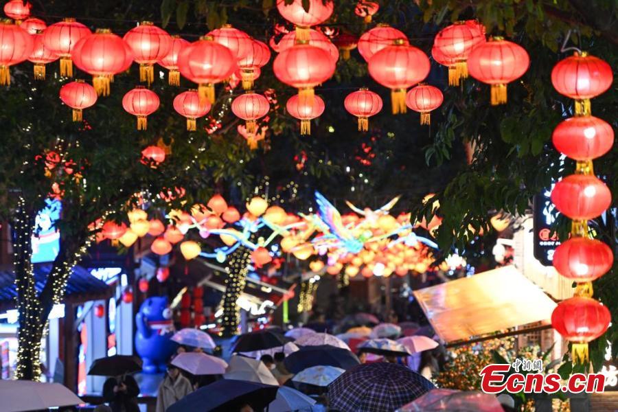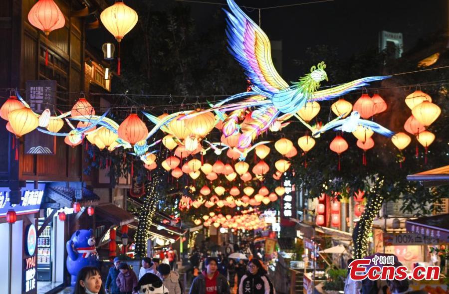 Tourists enjoy lanterns at the 18 Steps, a well-known popular tourist spot that features a blend of ancient architecture and modern retail spaces, in Chongqing, Jan. 25, 2025. (China News Service/He Penglei)