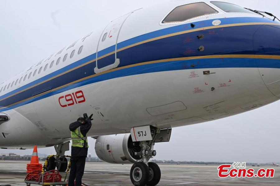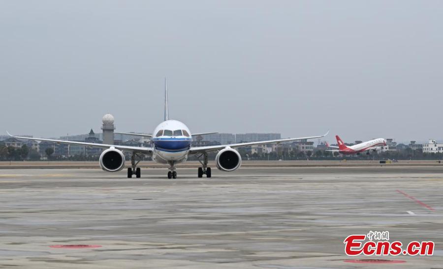 A C919 passenger jet operated by the China Southern Airlines lands at Xiaoshan International Airport in Hangzhou, east China's Zhejiang Province, Jan. 26, 2025. (China News Service/Wang Gang)