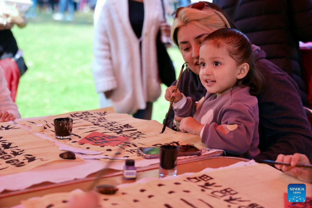 A girl learns Chinese calligraphy at the 4th edition of the Chinese New Year cultural festival at the National Arts Center in Mexico City, capital of Mexico, Jan. 25, 2025. The cultural festival kicked off here Saturday to celebrate the upcoming Spring Festival, or the Chinese Lunar New Year. (Xinhua/Li Mengxin)