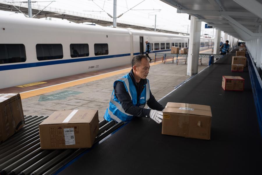 The file photo shows workers unload e-commerce parcels from a bullet train at Shuangliu West Railway Station in Chengdu, southwest China's Sichuan Province. (Xinhua/Jiang Hongjing)