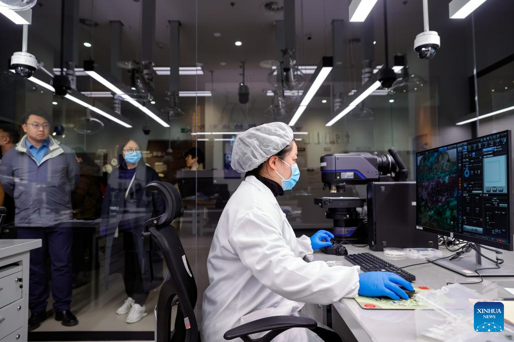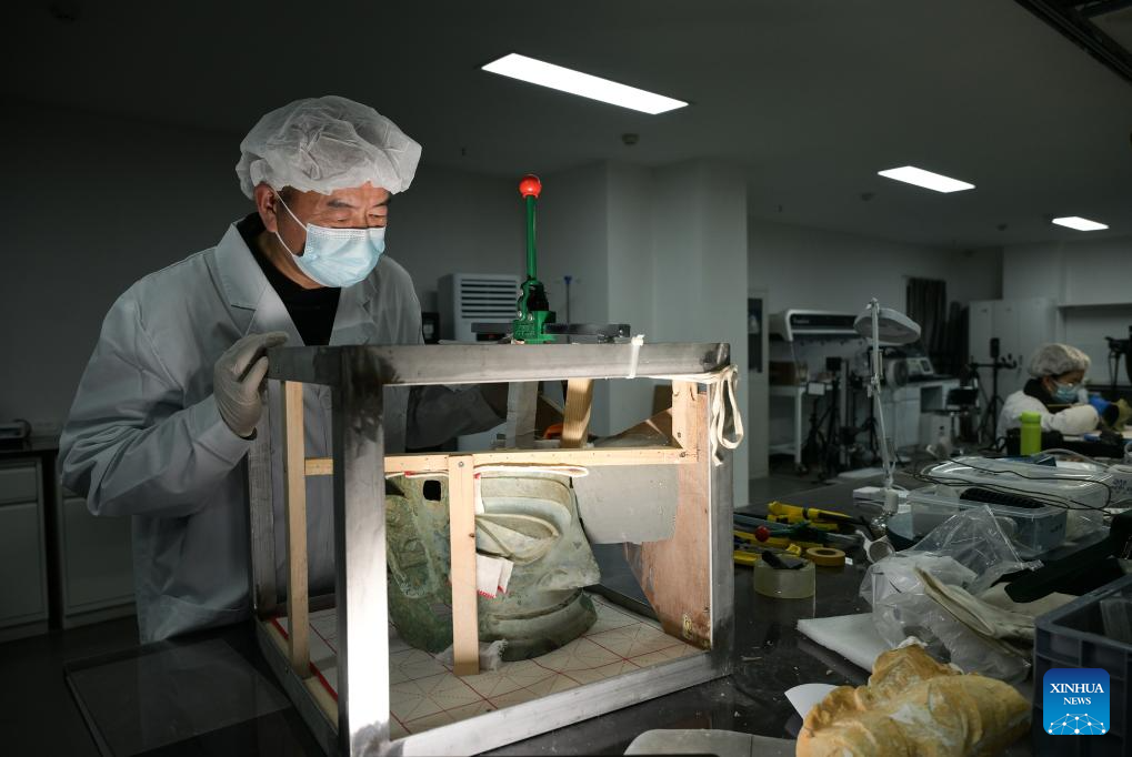 A restorer works in the cultural relics protection and restoration center in the new building of Sanxingdui Museum in Guanghan City, southwest China's Sichuan Province, Dec. 18, 2024.