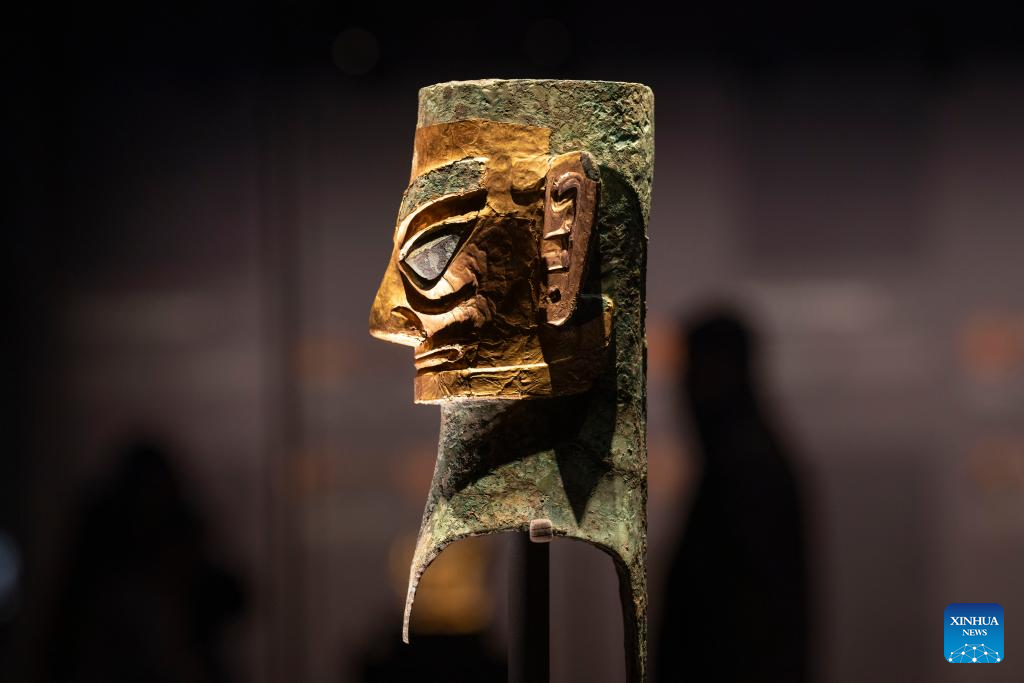 A bronze head with golden mask is on display in the new building of Sanxingdui Museum in Guanghan City, southwest China's Sichuan Province, Dec. 18, 2024.