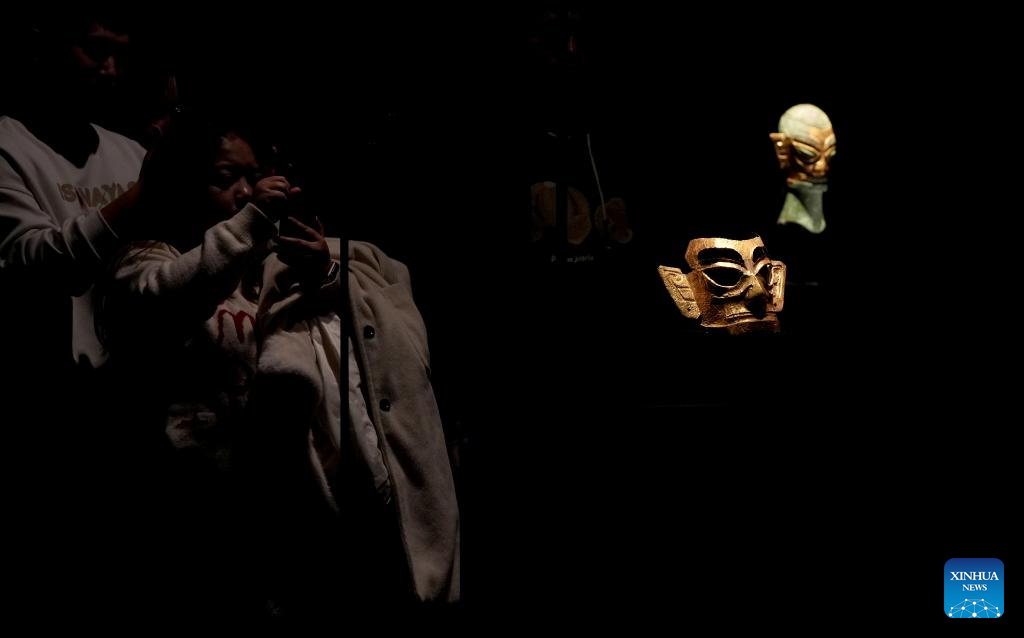 A visitor looks at a golden mask on display in the new building of Sanxingdui Museum in Guanghan City, southwest China's Sichuan Province, Dec. 18, 2024.