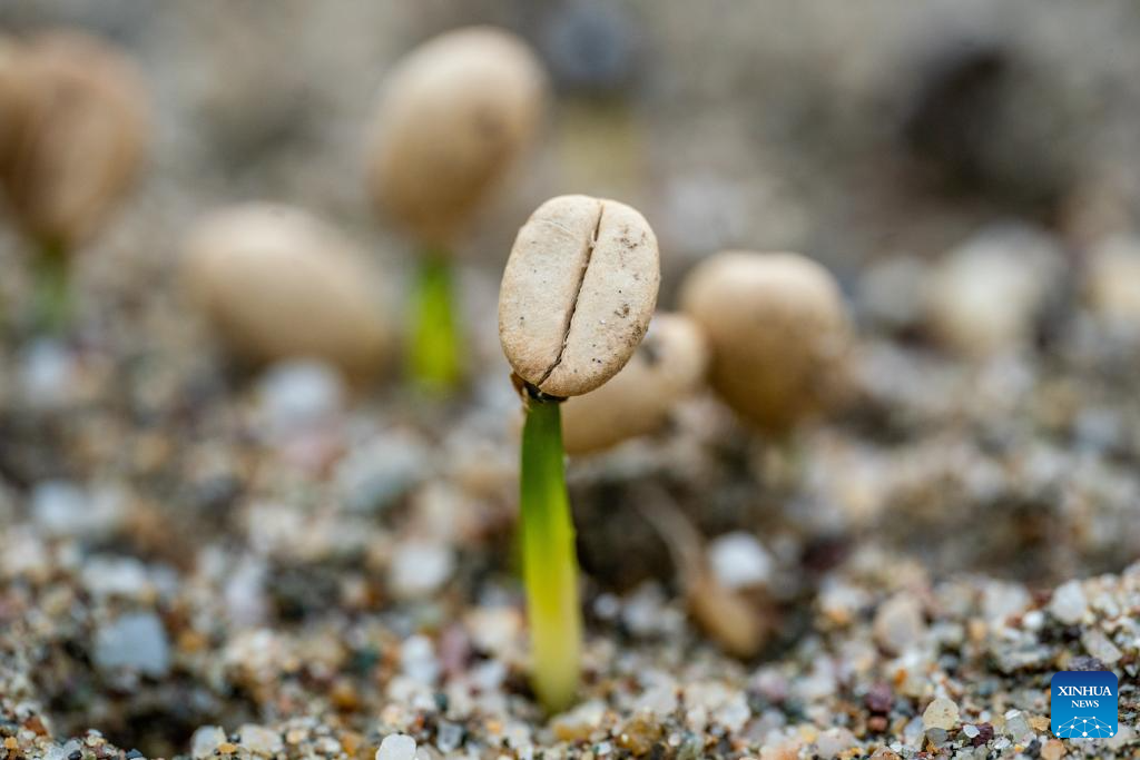 Coffee beans are seen sprouting at a plantation in Pu'er, southwest China's Yunnan Province, Jan. 8, 2025. As the Spring Festival approaches, many tourists who have just finished their trip in Yunnan choose to take home one or two bags of coffee beans that they roasted themselves. These beans have become a special festive gift this year, whether for friends and family or for personal enjoyment.