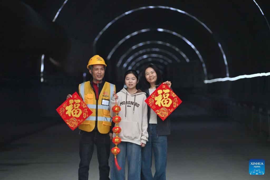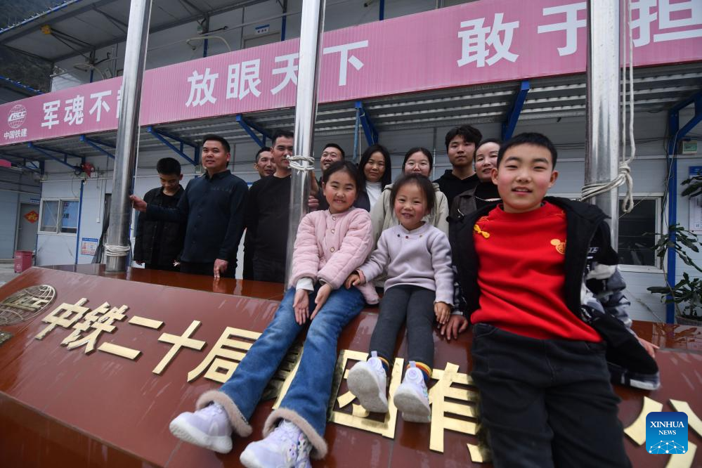 Workers and their family members are pictured at the construction site of an expressway linking Yufeng and Yizhou of south China's Guangxi Zhuang Autonomous Region in Liuzhou of Guangxi, Jan. 22, 2025.