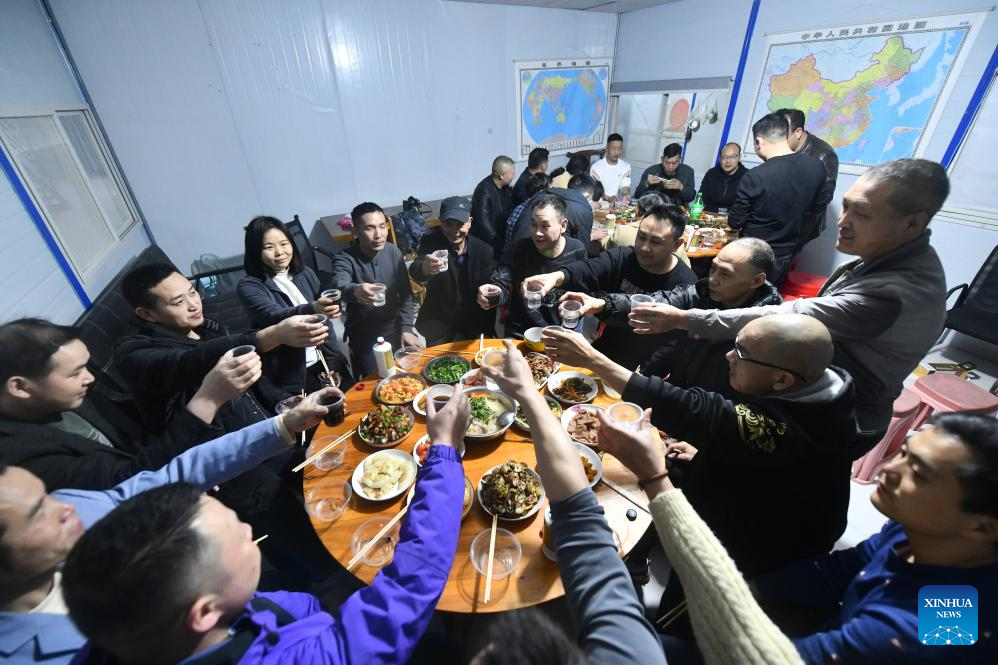 Workers and their family members have a family reunion dinner at the construction site of an expressway linking Yufeng and Yizhou of south China's Guangxi Zhuang Autonomous Region in Liuzhou of Guangxi, Jan. 22, 2025.