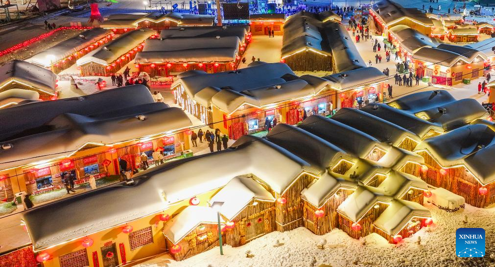 An aerial drone photo taken on Jan. 30, 2025 shows tourists enjoying themselves at a snow town scenic spot in Zunhua, north China's Hebei Province. People enjoy various activities to celebrate the Chinese New Year which falls on Jan. 29 this year. (Photo by Liu Mancang/Xinhua)