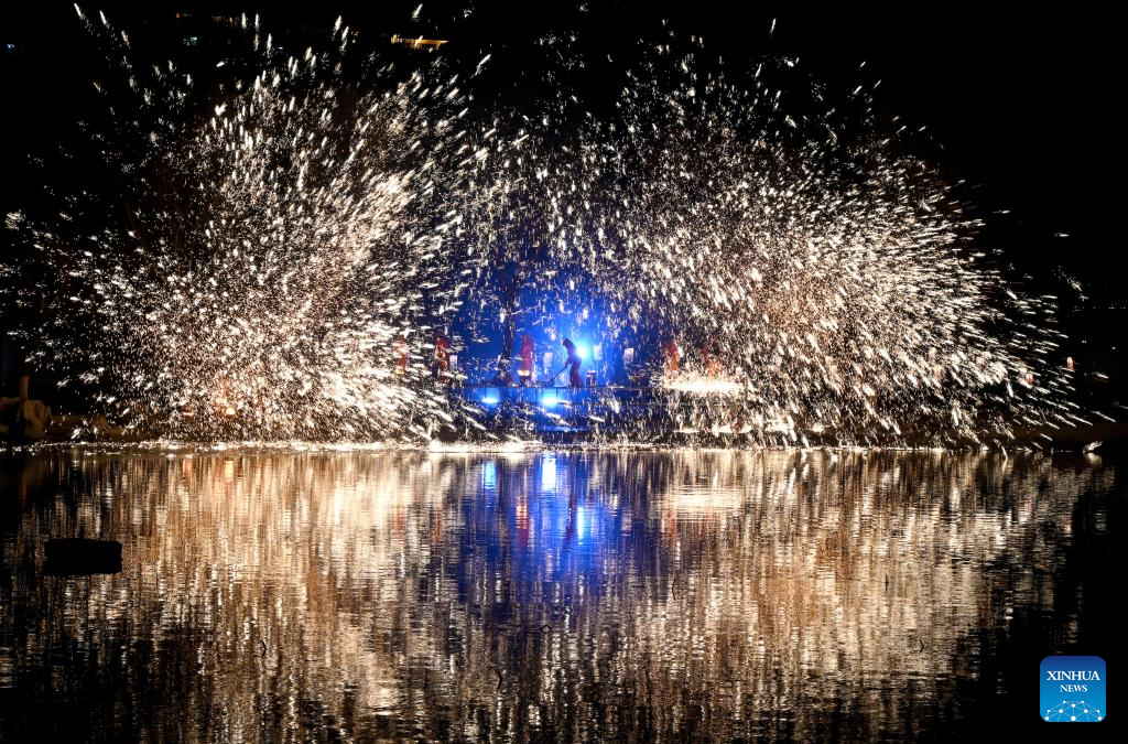 Folk artists perform a molten iron firework show at a park in Handan City, north China's Hebei Province, Jan. 30, 2025. People enjoy various activities to celebrate the Chinese New Year which falls on Jan. 29 this year. (Photo by Hao Qunying/Xinhua)