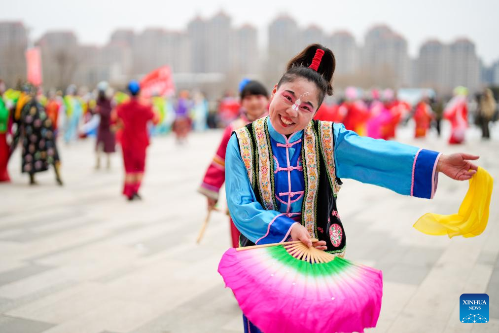 Folk artists stage a Yangge performance in Lunan District of Tangshan, north China's Hebei Province, Jan. 30, 2025. People enjoy various activities to celebrate the Chinese New Year which falls on Jan. 29 this year. (Photo by Zhao Liang/Xinhua)