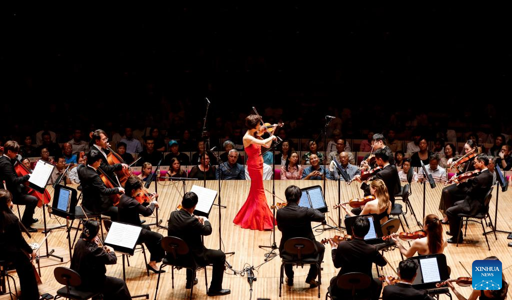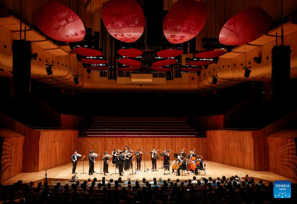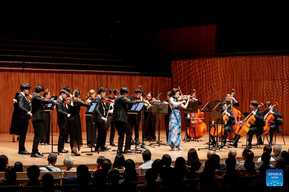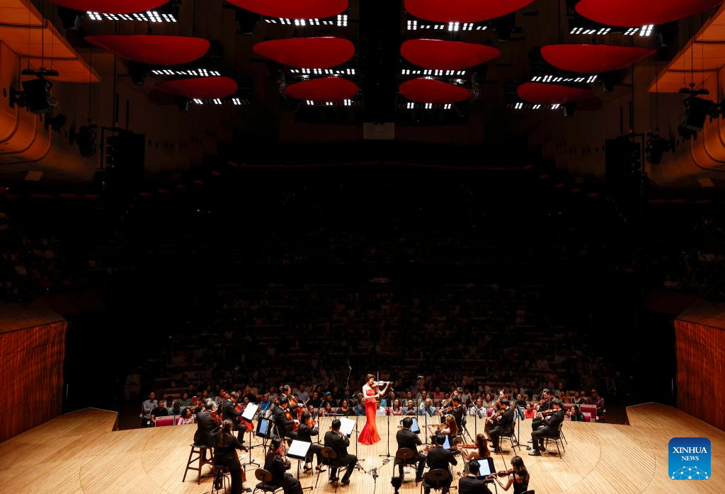 Violinist Yao Jue (C) and the Hong Kong String Orchestra perform during a Chinese Lunar New Year Concert at the Opera House in Sydney, Australia, Feb. 2, 2025. (Xinhua/Ma Ping)