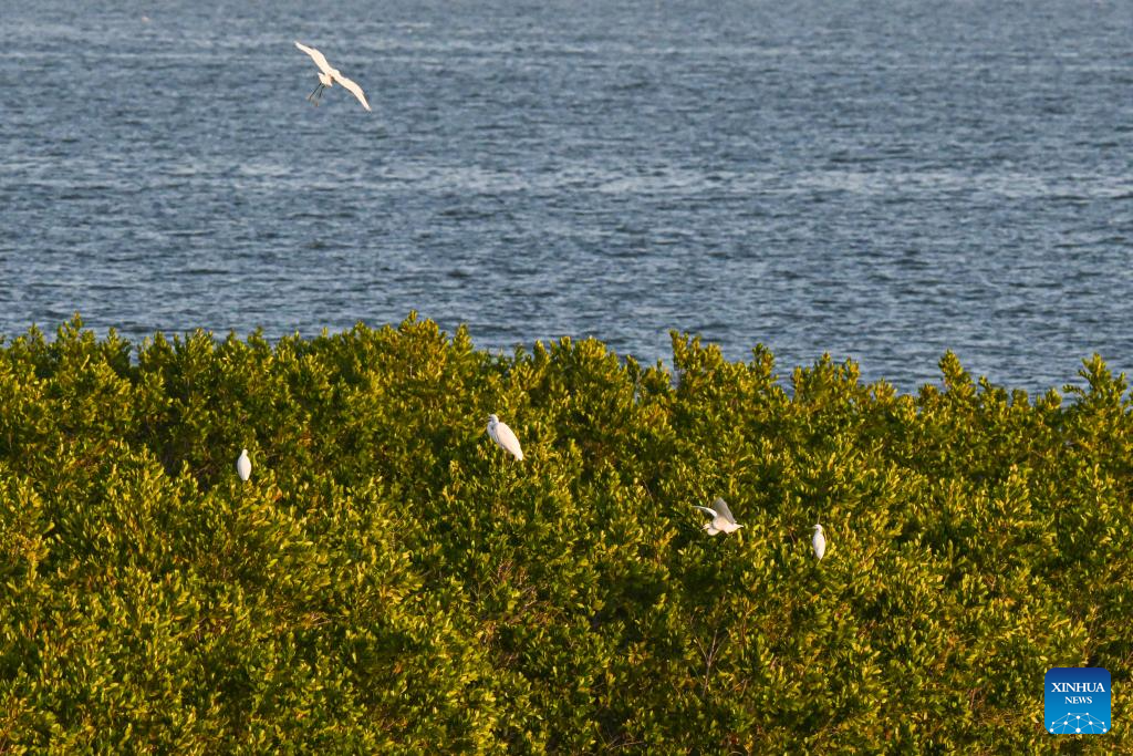 Egrets perch at the Hainan Lingshui Mangrove National Wetland Park in south China's Hainan Province, Jan. 31, 2025. Home to thousands of waterfowl, the park covering 958.22 hectares has resulted from uncompromising efforts of the local authorities since 2016 to restore and protect the mangrove ecological systems. (Xinhua/Pu Xiaoxu)