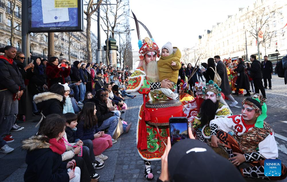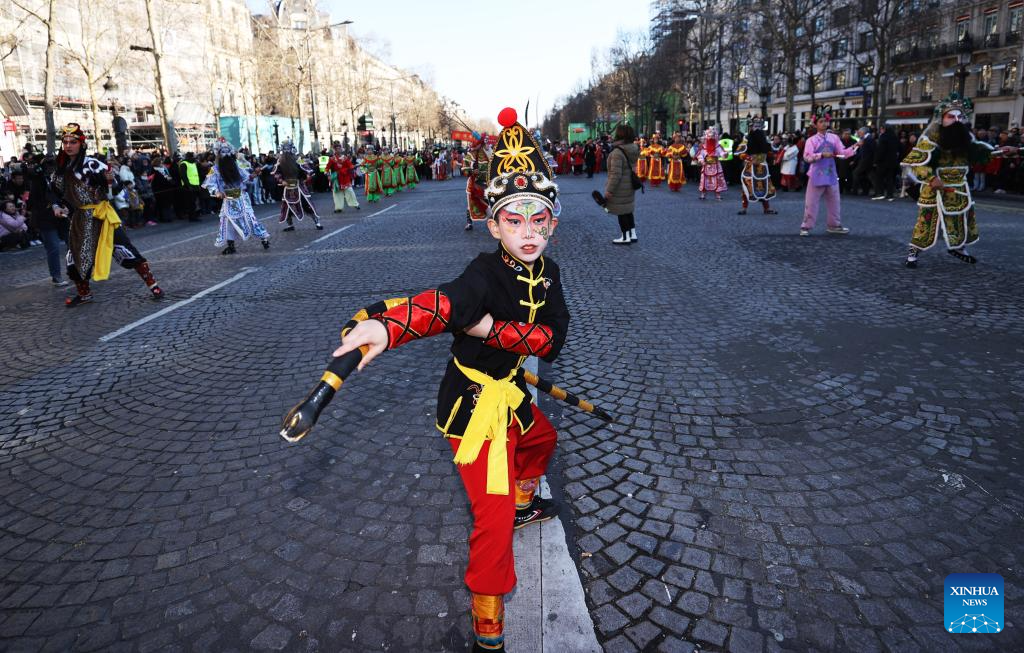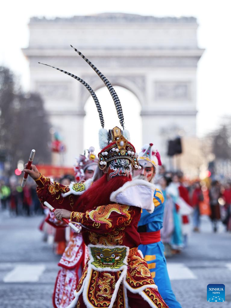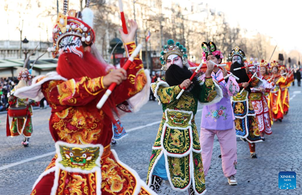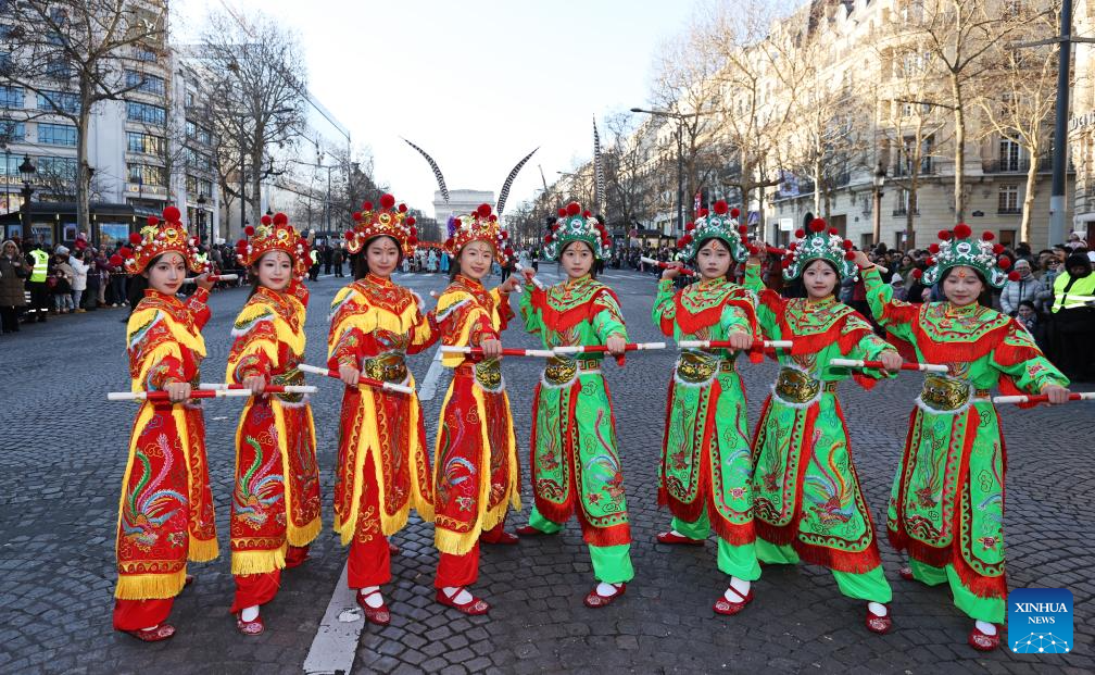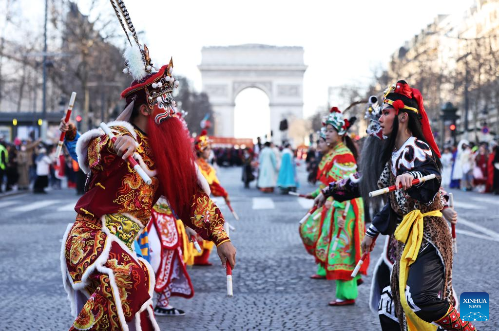 Members of a Yingge team perform Chaoyang Yingge dance during the Spring Festival celebration on the Champs-Elysees avenue in Paris, France, Feb. 2, 2025.