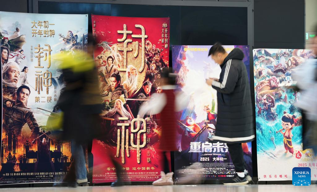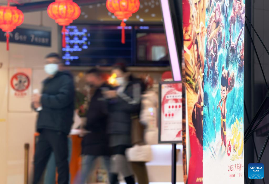 People walk past a movie poster at a cinema in Shenyang, northeast China's Liaoning Province, Feb. 4, 2025. (Xinhua/Li Gang)
