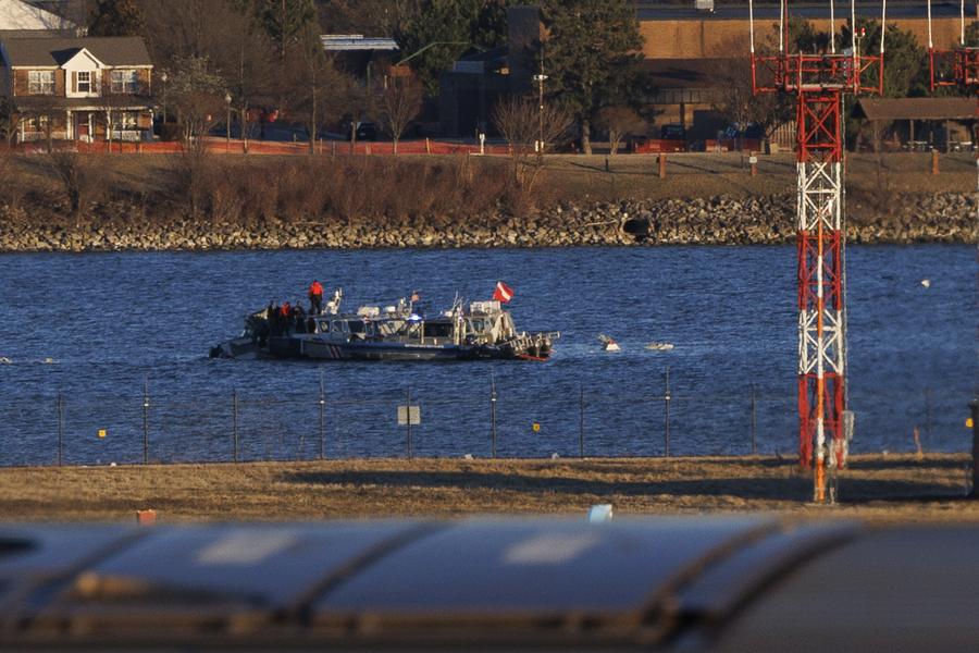 Crews search at the wreckage site of a fatal midair collision between an American Airlines plane and a military helicopter in the Potomac River near the Ronald Reagan Washington National Airport, Arlington, Virginia, the United States, Feb. 1, 2025. (Photo by Aaron Schwartz/Xinhua)