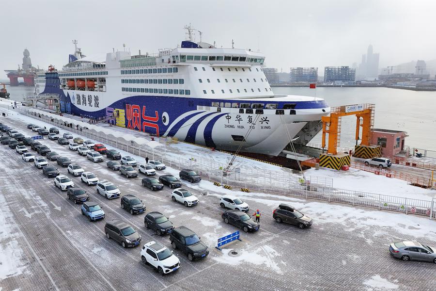 A drone photo taken on Feb. 4, 2025 shows vehicles driving into a ferry at Yantai Port in east China's Shandong Province. (Photo by Tang Ke/Xinhua)