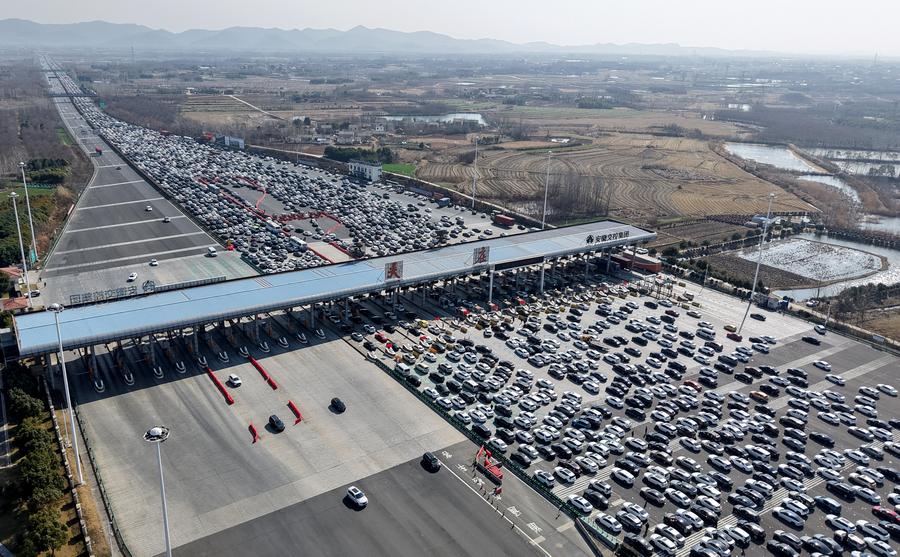 A drone photo taken on Feb. 4, 2025 shows vehicles at a toll gate of Hefei-Nanjing expressway in Quanjiao County, Chuzhou City of east China's Anhui Province. (Photo by Shen Guo/Xinhua)