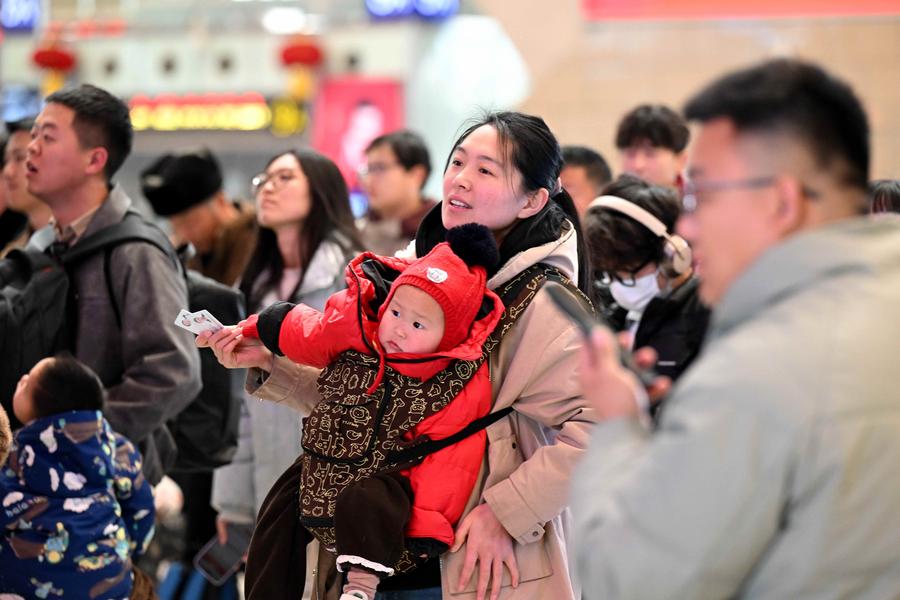 Passengers check in at Shijiazhuang Railway Station in Shijiazhuang, north China's Hebei Province, Feb. 4, 2025. (Photo by Chen Qibao/Xinhua)